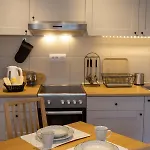 מטבח מאובזר מאובזר עם מדיח כלים, מקרר וכלי מטבח.